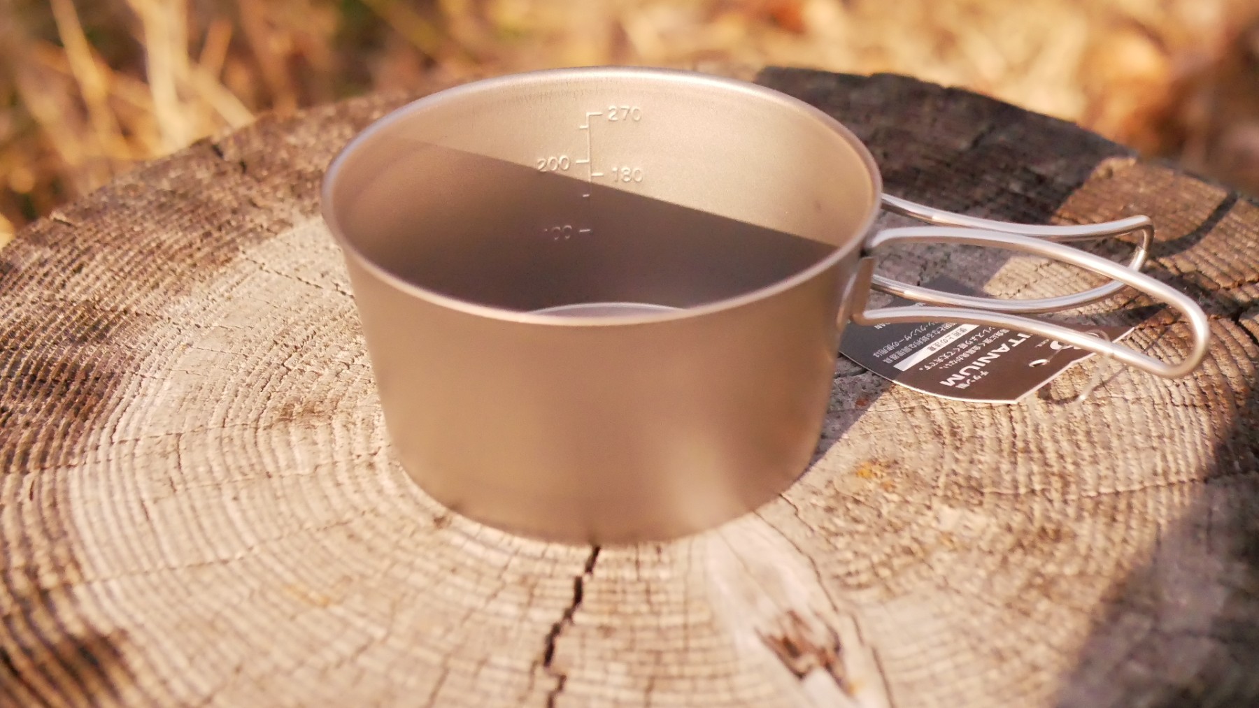 オーソドックスな形状のチタン製シェラカップ。チタン製の特徴は強度による軽さと熱伝導の低さです。軽さはもちろん魅力ですが、熱々のスープやコーヒーを飲む時に飲み口が熱くならずに飲めることは最大の魅力です。もちろんハンドル部分にお箸を引っかけることができます!