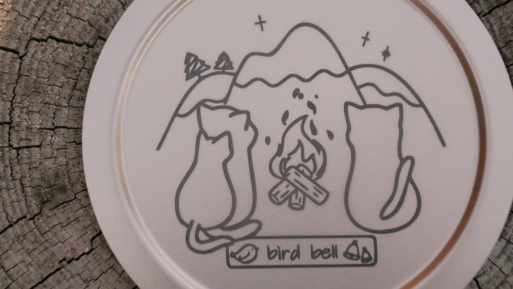 山城跡でもあるバードベルの裏山の4つの郭を表現した背景に、バードベルの愛猫達が焚火にあたっている様子がキュートな円形のステッカー✨ギアボックスやテーブル、はたまたお車に貼ってみてはいかがでしょうか✨